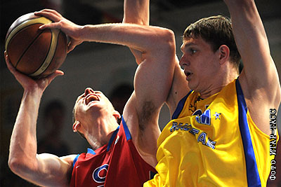 Игроки ЦСКА Рамунас Шишкаускас и "Химок" Тимофей Мозгов (слева направо) в финальном матче чемпионата России по баскетболу: "Химки2 (Московская область) – ЦСКА (Москва) – 57:76