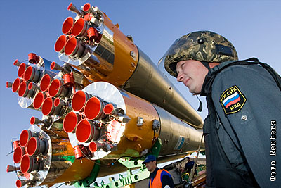 Общая сборка ракеты космического назначения "Союз-ФГ" с транспортным пилотируемым кораблем "Союз ТМА-15" в монтажно-испытательном корпусе