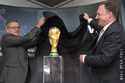 Генеральный директор Visa в России Маартен ван ден Белт и спортивный комментатор Виктор Гусев (слева направо) на презентации Кубка Мира ФИФА 2010 в пресс-центре БСА "Лужники"