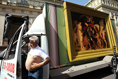 Автомобиль с копией картины из собрания Эрмитажа во время акции "Путешествие картин", посвященной празднованию Дня города, на Миллионной улице