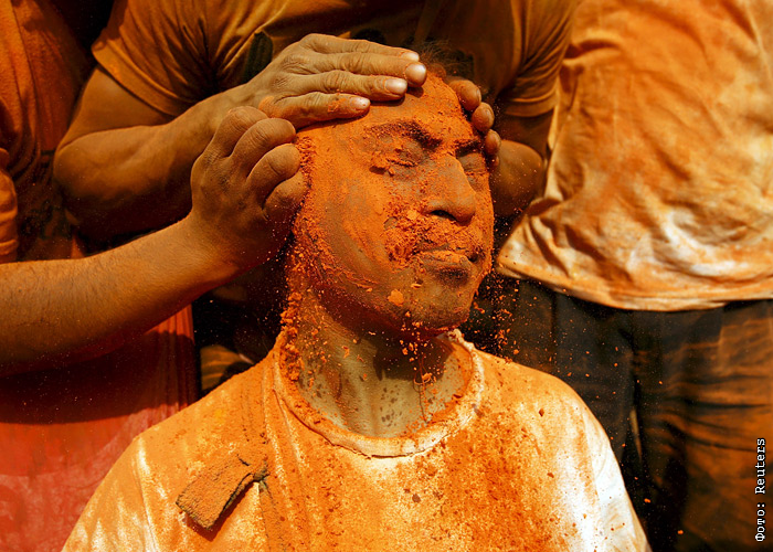 Участника фестиваля Синдур Джатра в Непале покрывают порошком киновари