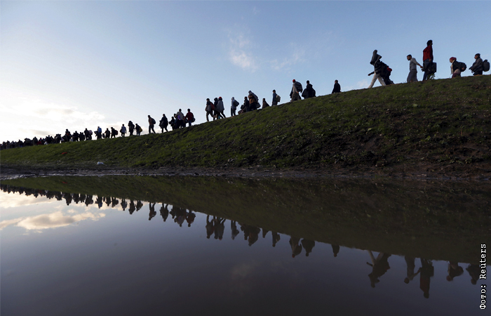 Мигранты направляются к пограничному пункту у словенского города Брежица, 20 октября 2015 года