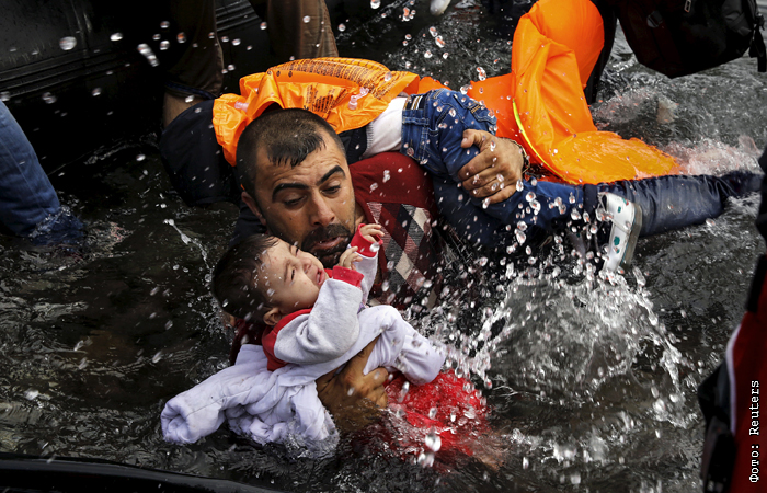 Сирийский беженец с детьми сходит с переполненной шлюпки после пересечения Эгейского моря, 24 сентября 2015 года