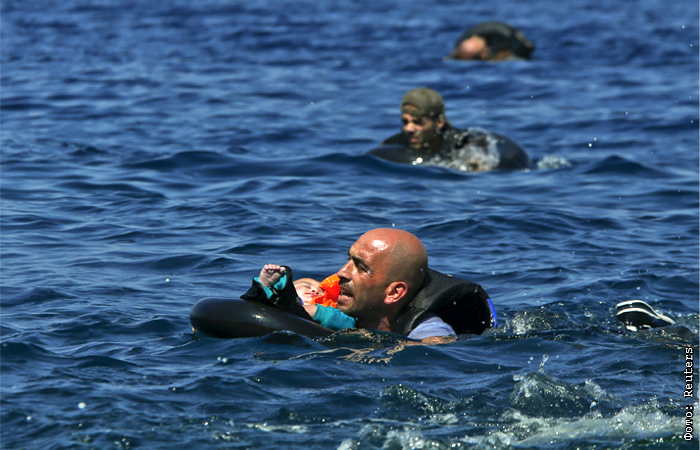 Беженец плывет с ребенком в спасательном круге после того, как их лодка перевернулась в 100 метрах от греческого острова Лесбос, 13 сентября 2015 года