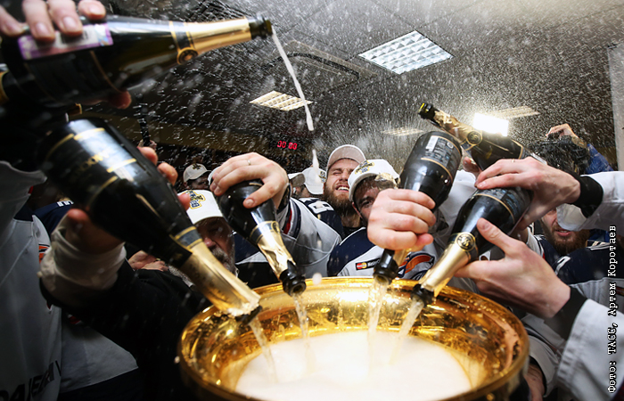 Игроки "Металлурга" после победы по традиции наполняют Кубок Гагарина шампанским