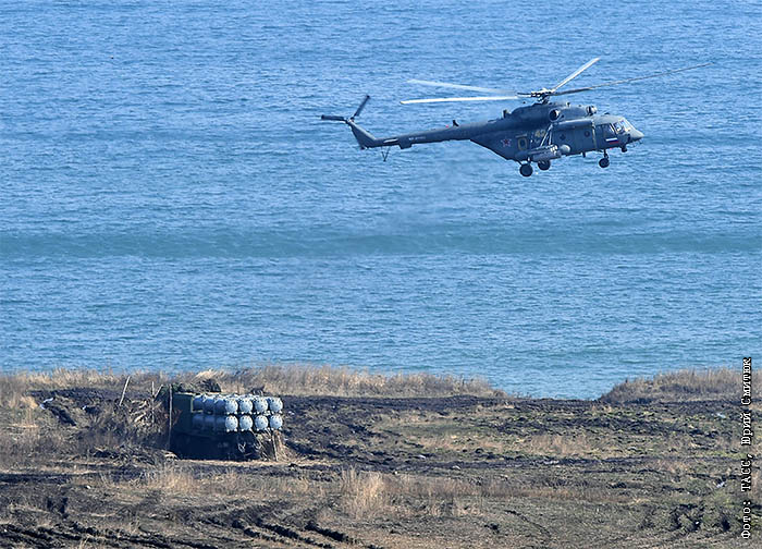 На фото: Вертолет Ми-8АМТШ военно-транспортной авиации ВВО на межвидовых учениях армейских и флотских подразделений Восточного военного округа на морском десантном полигоне "Клерк"