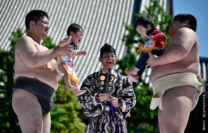На территории древнего буддийского храма Сэнсодзи в Токио прошел ежегодный фестиваль плачущих детей. Во время турнира борцы сумо выносят малышей на арену, поднимают высоко над землей и пытаются вызвать у них плач. Победителем признается тот ребенок, кто заплачет первым. В мероприятии приняли участие свыше 100 детей.