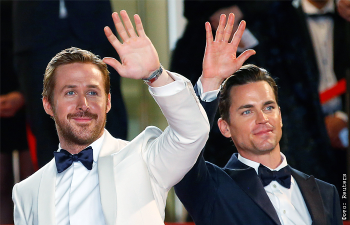 Голливудские актеры Райан Гослин и Мэтт Бомер перед показом фильма "Славные парни"