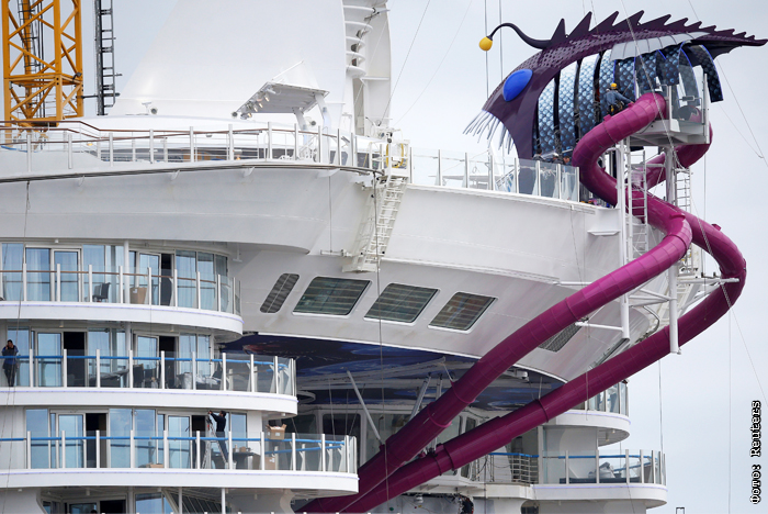 Отличительной особенностью нового корабля стало наличие на нем водной горки, которая проходит через 10 палуб