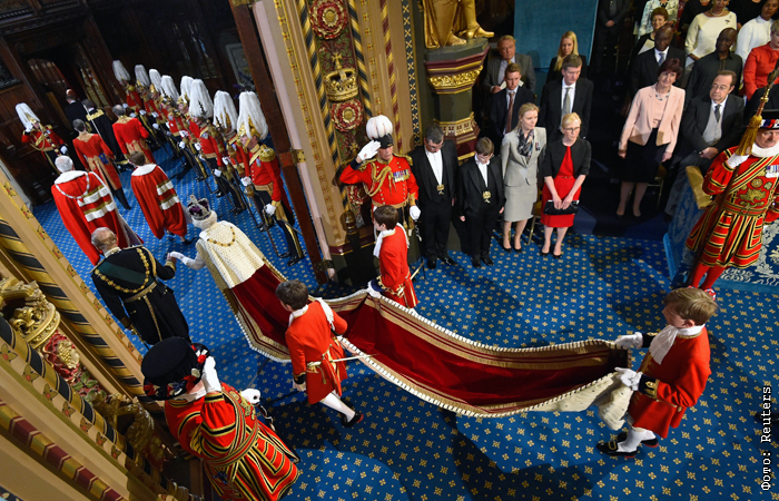В Лондоне королева Елизавета II открыла новую сессию парламента Великобритании. В тронной речи были изложены главные политические направления работы на следующий год. По традиции в этот день королева одела государственный наряд - платье кремового цвета с 6-метровым шлейфом и мантию из горностая. В него Елизавета II облачается только один раз в году.