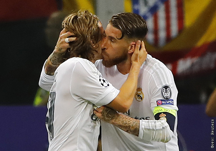 Защитник "Реала" Серхио Рамос (справа) отмечает забитый мяч с партнером по команде Лукой Модричем