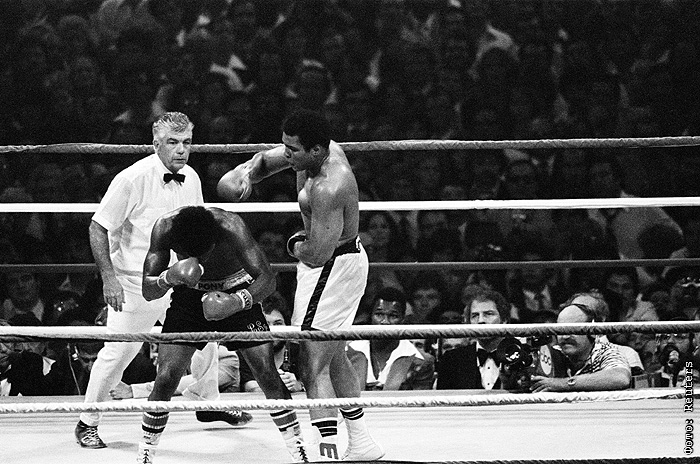 Мохаммед Али наносит удар Леону Спинксу во время их второго поединка в Новом Орлеане в 1978 году. Судьи единогласно отдали победу Али, и тот взял реванш у Спинкса за поражение, которое он потерпел шестью месяцами ранее.