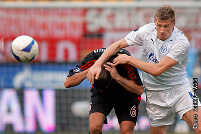 Игроки "Баварии" Мартин Домикелис и "Зенита" Павел Погребняк в матче полуфинала Кубка УЕФА по футболу: "Зенит" (Россия) - "Бавария" (Германия)