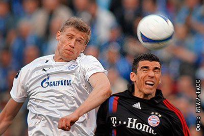 Игроки "Зенита" Павел Погребняк и "Баварии" Лусио в матче полуфинала Кубка УЕФА по футболу