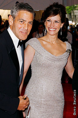 Актеры Джордж Клуни и Джулия Робертс на торжественном гала-приеме, посвщенном открытию выставки "Супергерои: Мода и Фантазия" в музее Метрополитен (Нью-йорк)