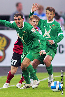 Игроки "Рубина" Дато Квирквелия (слева), Сергей Семак (справа) и игрок "Москвы" Виталий Калешин (в центре) в матче чемпионата России по футболу: "Москва" (Москва) – "Рубин" (Казань)