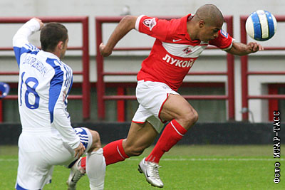 Игрок "Шинника" Славолюб Джорджевич и спартаковец Соарес Веллитон (слева направо) в матче чемпионата России по футболу: "Спартак" (Москва) – "Шинник" (Ярославль) – 4:2