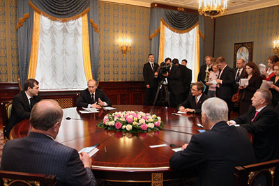 Исполняющий обязанности заместителя главы администрации президента РФ Владислав Сурков, Владимир Путин, руководитель фракции "Справедливая Россия" Николай Левичев и лидер ЛДПР Владимир Жириновский (справа) на встрече с лидерами думских фракций.