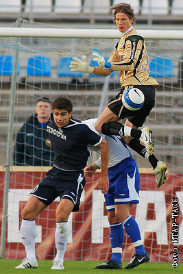 Игрок "Крыльев Советов" Евгений Савин и вратарь динамовцев Антон Шунин (слева направо) в матче чемпионата России по футболу: "Динамо" (Москва) – "Крылья Советов" (Самара) – 2:2