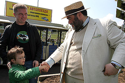 Главный редактор журнала "Русский пионер", обозреватель "Коммерсанта" Андрей Колесников с сыном Ваней и организатор фестиваля, глава компании Bosco di Ciliegi Михаил Куснирович перед началом традиционной посадки деревьев в рамках фестиваля "Черешневый лес", прошедшей на ВВЦ в Мичуринском саду