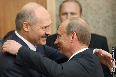Президент Белоруссии Александр Лукашенко (слева) приветствует премьер-министра России Владимира Путина на встрече Содружества Независимых Государств (СНГ) в Минске.