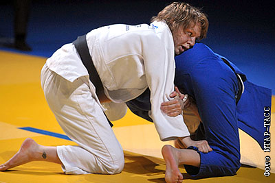 Российская спортсменка Мария Проскура (в белом) во время поединка с украинской спортсменкой Ольгой Суха (в синем) в весовой категории до 52 кг во Дворце спорта "Мегаспорт" на Ходынке