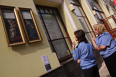 Проект ГМИИ им. А.С.Пушкина "Арт-тур: Шедевры на улицах Москвы" проходит в столице. Репродукция картины художника Сандро Ботичелли "Благовещение" на одной из улиц города