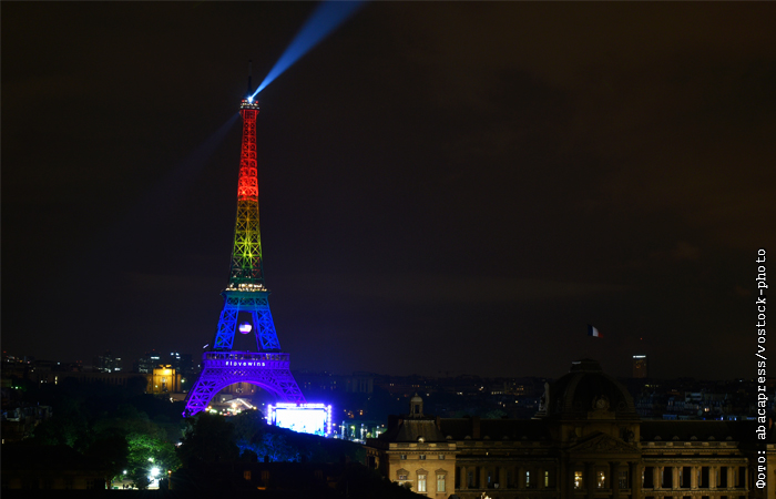 Эйфелевая башня в Париже, подсвеченная в цвета радужного флага ЛГБТ в знак скорби и солидарности с семьями погибших