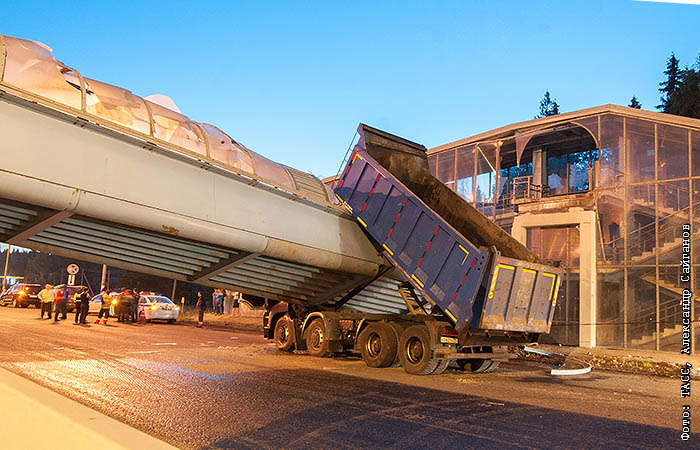 Грузовик "МАН" столкнулся с надземным пешеходным мостом, в результате часть пешеходного перехода обрушилась и заблокировала движение на автотрассе М-10 в районе Солнечногорска