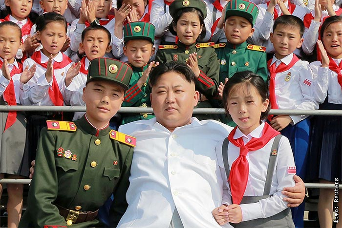 Ким Чен Ын встретился с северокорейскими детишками. Дорогому лидеру дети приготовили выступление под названием "Мы самые счастливые в мире!". Все это в честь семидесятилетия образования Корейского детского союза.