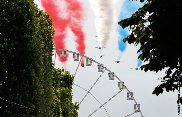 Во Франции прошел традиционный военный парад по случаю Дня взятия Бастилии. Празднования открылись пролетом самолетов "Альфа Джет" пилотажной группы "Патруль де Франс" над Парижем, которые окрасили небо цветами национального флага.