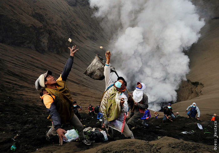 Жертвоприношения вулкану Бромо на острове Ява в Индонезии