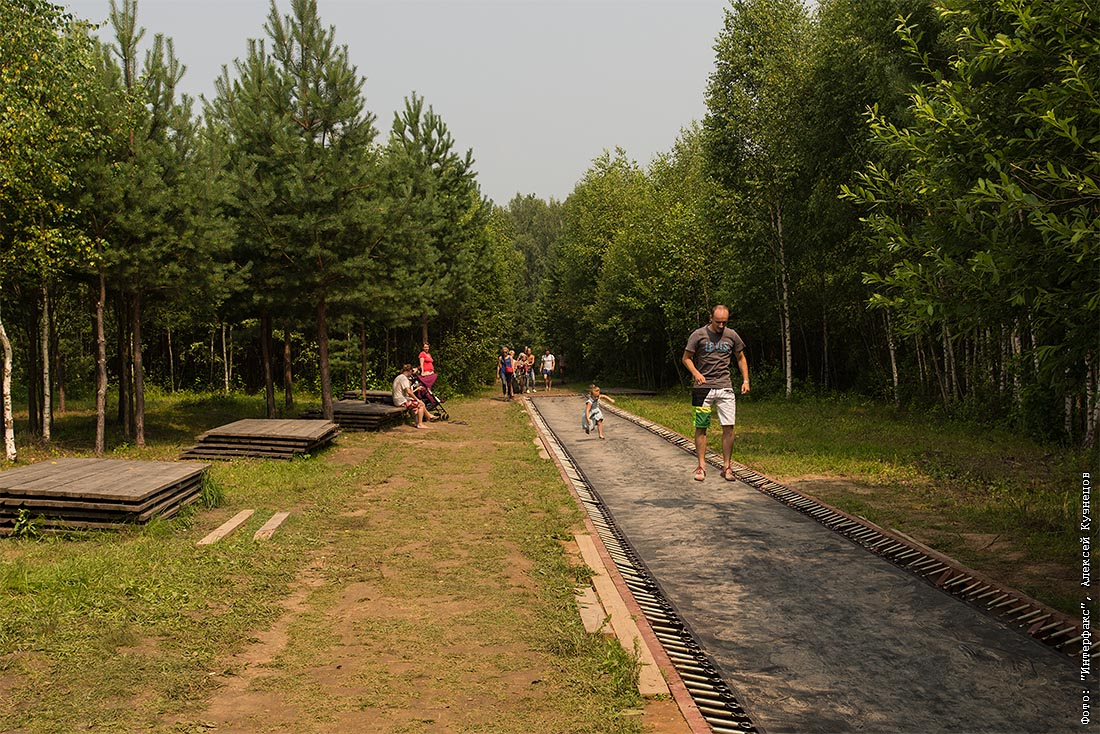 "Скорая тропа" создана, чтобы помочь всем желающим переосмыслить свое передвижение. Очень актуальная в данном пространстве штука: если вам не удалось, по каким-то причинам, взять с собой репеллент, отпугивающий слепней и прочих природных монстров, присутствующих здесь в изобилии, то по этой дорожке можно от них весело упрыгать.