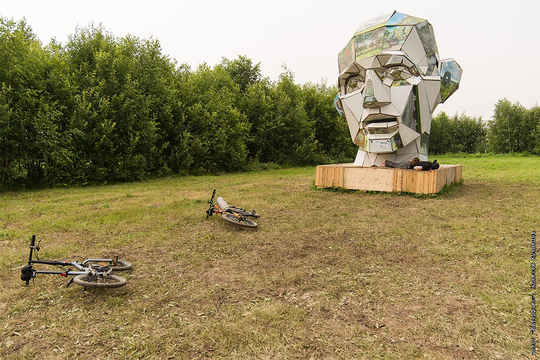 Впрочем, оставим шутки. Вот "Голова "Дом бомжа". Созданная из полотен на демонтируемых подрамниках (можно снять холст и пойти немножечко потворить где-то в укромном месте) демонтируется, как только все холсты становятся картинами. Судя по всему, "Голова" действует немного успокаивающе, но выглядит потрясающе. Можно забраться внутрь и передать привет Малковичу. Или не передавать.
