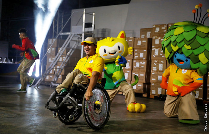 Собирательные образы бразильской фауны и флоры стали талисманами Олимпиады и Паралимпиады. Олимпийский талисман Рио изображен в виде улыбающегося желтого зверя, символизирующего богатую фауну Бразилии. Паралимпийский выполнен в зеленых цветах и олицетворяет флору. Талисманы были названы в честь известных бразильских музыкантов и композиторов Винисиуса ди Морайса и Тома Жобима.