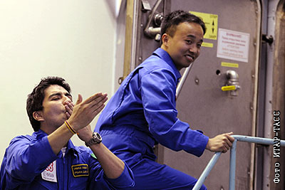 Участники проекта "Марс-500" инженер Диего Урбина и исследователь Ванг Юэ (слева направо) во время пресс-конференции перед началом эксперимента по моделированию полета на Марс в Институте медико-биологических проблем РАН