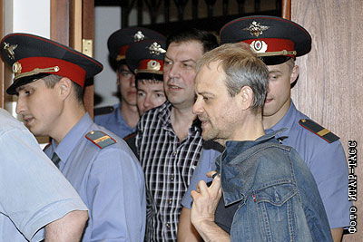 Роман Чубатов и Борис Лисагор (слева направо), обвиняемые в мошенничестве и сбыте конфиската на сумму 550 миллионов рублей, перед началом оглашения приговора в Мосгорсуде