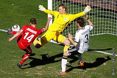 Сборная Германии оставшись в меньшинстве на 37-й минуте матча проиграла сборной Сербии со счетом 1:0 во втором туре группы "D"