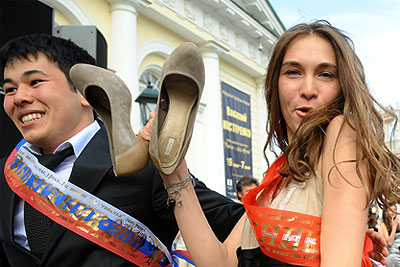 Выпускники на Манежной площади перед началом театрализованного бала "Выпускник - 2010", который прошел в Кремлевском Дворце