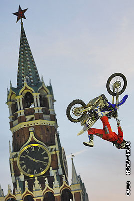Американский райдер Нейт Адамс, занявший 2-е место, во время соревнований по фристайл-мотокроссу Red Bull X-Fighters на Красной площади