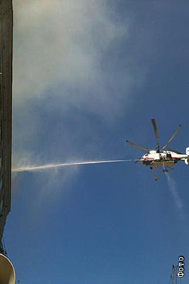 Вертолет завис над горящим зданием НПО "Алмаз" и произвел сброс нескольких тонн воды. Горящее строение имеет в высоту семь этажей и расположено не на самом Ленинградском проспекте, а в прилегающем квартале на охраняемой территории. К месту пожара прибывает второй вертолет с подвесным резервуаром воды.