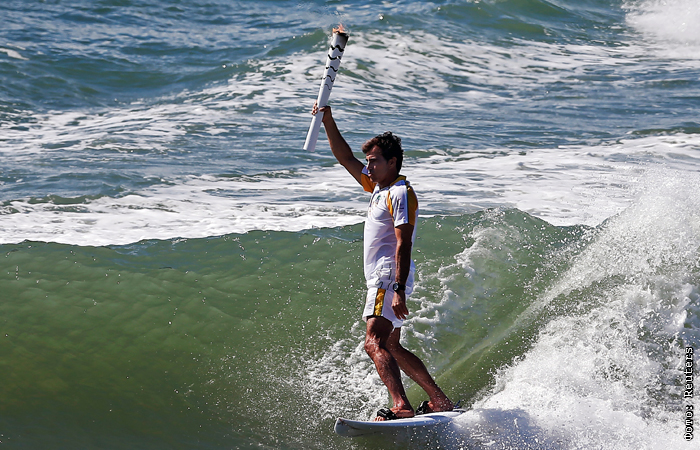 Бразильский серфер Карлос Бурле принимает участие в эстафете Олимпийского огня в Ипожуке, штат Пернамбуку