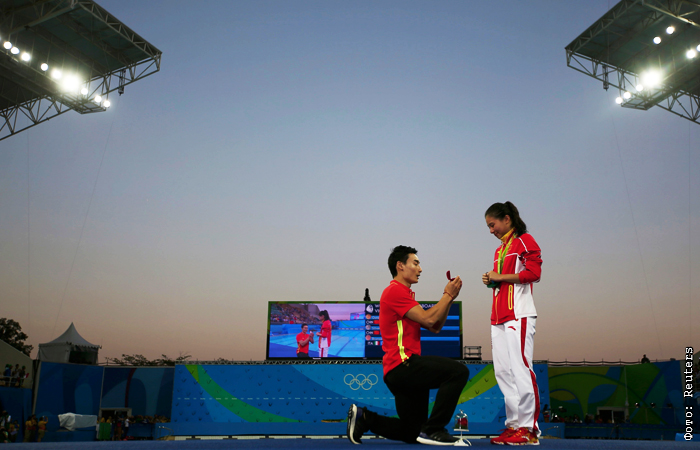 Китайский спортсмен Цинь Кай сделал предложение своей возлюбленной, прыгунье Хэ Цзы, после того как девушка выиграла серебряную медаль в прыжках в воду с трехметрового трамплина. Хэ Цзы расплакалась и приняла предложение спортсмена.