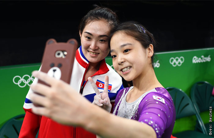 Гимнастки Ли Юн Чжу из Южной Кореи и Хон Ын Чон из КНДР сфотографировались во время квалификационных соревнований, доказав, что спорт еще может объединять людей.