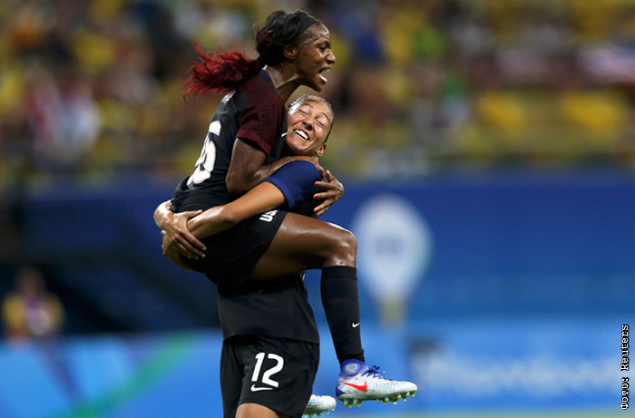 Игроки женской футбольной сборной США Кристен Пресс и Кристал Данн радуются забитому голу в третьем туре группового этапа олимпийского турнира против сборной Колумбии