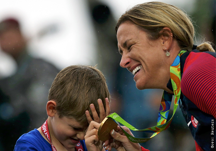 Американская велогонщица Кристин Армстронг, завоевавшая золотую медаль в индивидуальной гонке с раздельным стартом, с сыном Лукасом на церемонии награждения