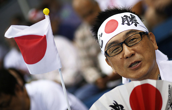 Японский болельщик на мужском плавании на 100 м вольным стилем