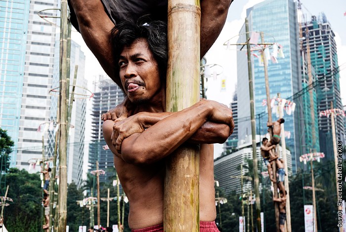 Участники традиционной игры Панжат Пинанг в День независимости в Индонезии