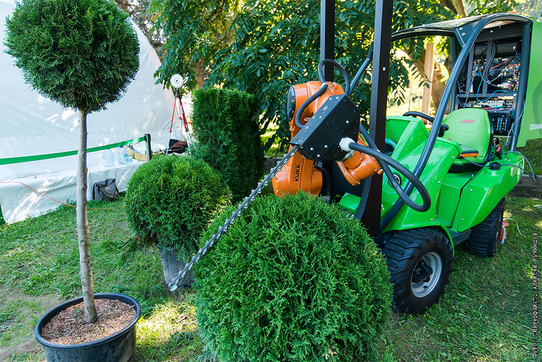 Среди умиротворенных и тихих ухоженных уголков спрятался достаточно неожиданный экспонат - GARDY. Как объясняет разработчик, "Gardy - мобильный топиарный робот для создания сложных геометрических и художественных форм из зеленых насаждений". Российская разработка, а вот шасси, правда, финское. Тем не менее это робот, стригущий кусты и стригущий их художественно. Сила!