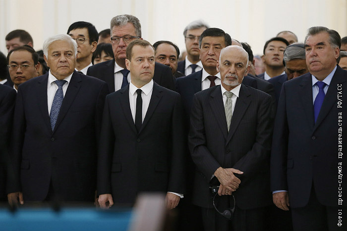 Глава российского правительства Дмитрий Медведев (второй слева на первом плане), президент Афганистана Ашраф Гани Ахмадзай (второй справа) и президент Таджикистана Эмомали Рахмон (справа)